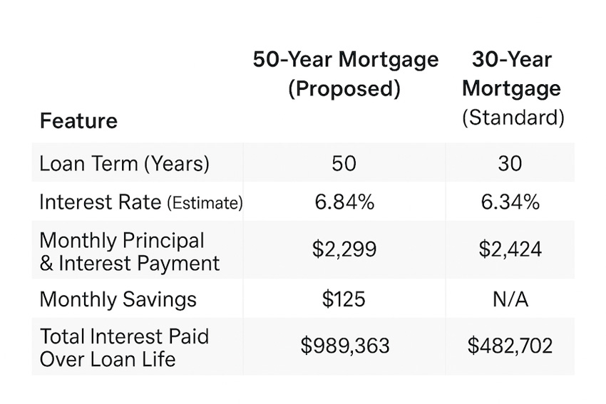 These numbers show that while the monthly payment difference may seem attractive, the total cost over the life of a 50-year loan is substantially higher. Actual payments could vary depending on interest rates, and many homeowners refinance or move before 30 years, which would alter the long-term impact.
